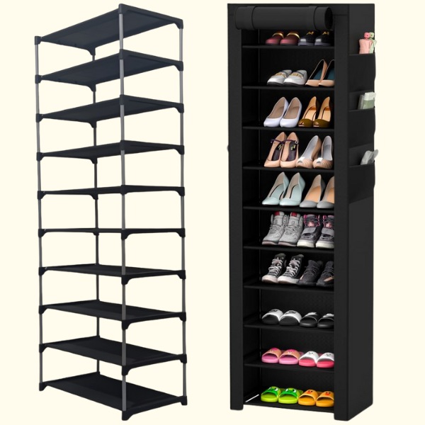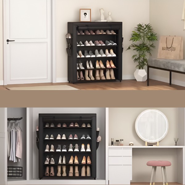 Varustatud tolmukindla kangast katte ja tõmblukuga. See jalanõude riiul tagab, et teie jalanõud püsivad puhtad, kaitstes neid tolmu ja mustuse eest.