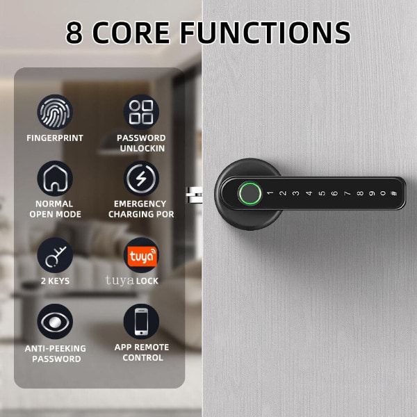 Lukustuse avamise võimalused: Sõrmejälg, mehaaniline võti, salasõna, mobiilirakendus (Tuya App), ajutine salasõna.